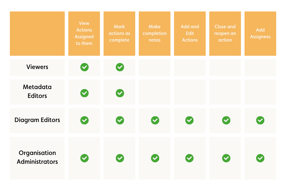 Once an action is created, only Organisation Administrators, the Action Owner (either the Organisation Admins or a Diagram Editor), or Diagram Editors with granted access can edit its contents.