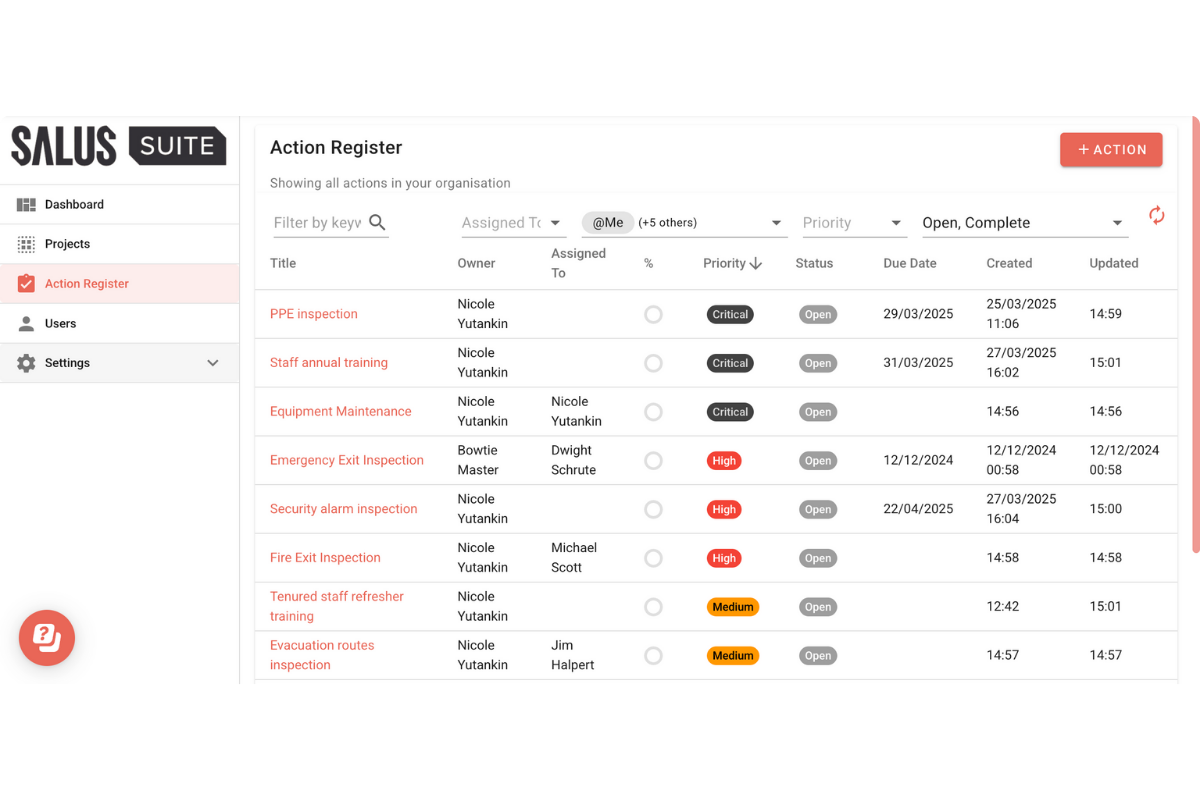 Action Register is a tool in Salus Suite that enables users to create and assign actions. It includes priority levels and a final due date option, allowing users to highlight tasks of importance, ensuring nothing gets overlooked. At its core, this feature promotes accountability within teams and organisations, helping to develop strong barrier management systems.