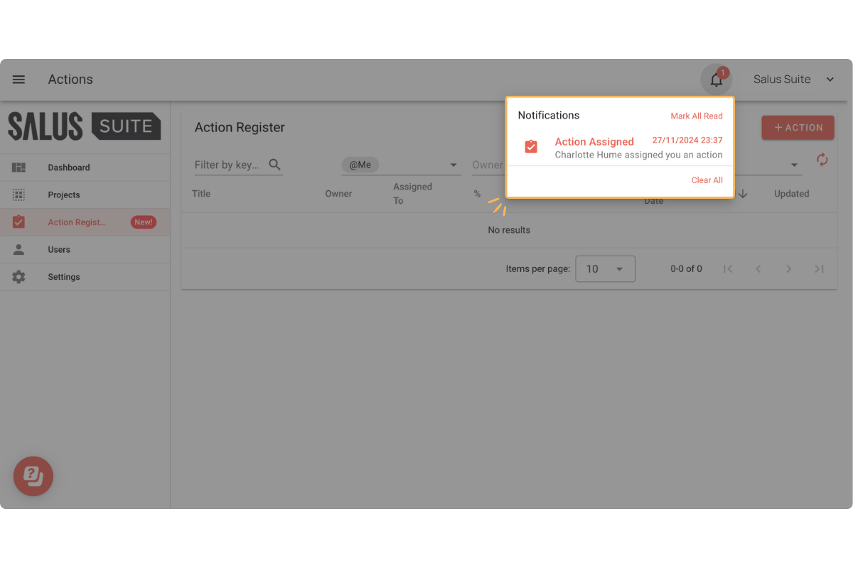 We designed the Action Register with all user levels in mind, promoting engagement and accountability across the board. While every Salus Suite user may access the feature, permissions vary per role.